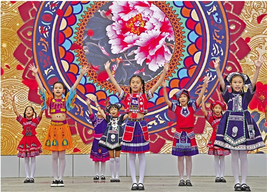 | 4月17日,孩子们在广西南宁市滨湖路小学表演民族舞蹈。 当日,南宁市滨湖路小学举行庆祝“三月三”主题教育活动暨2023年青秀区民族团结进步宣传月启动仪式。随着传统节日“壮族三月三”临近,广西各地陆续开展丰富多彩的庆祝活动。 新华社记者 周华 摄 |