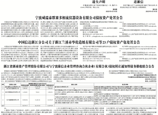 中国信达浙江分公司关于浙江兰溪市华伦造纸有限公司等23户债权资产包处置公告