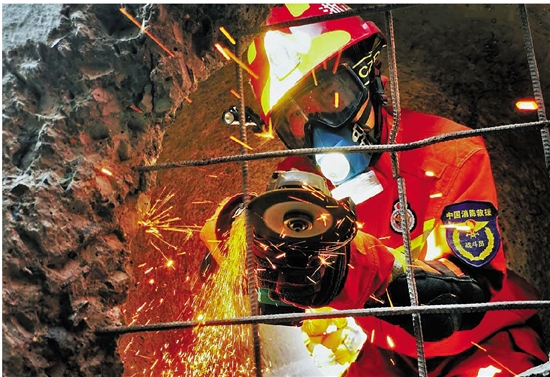 近日,台州湾新区消防救援大队开展地震救援技术培训。图为消防救援人员模拟在狭小空间内对钢筋网进行快速破拆。