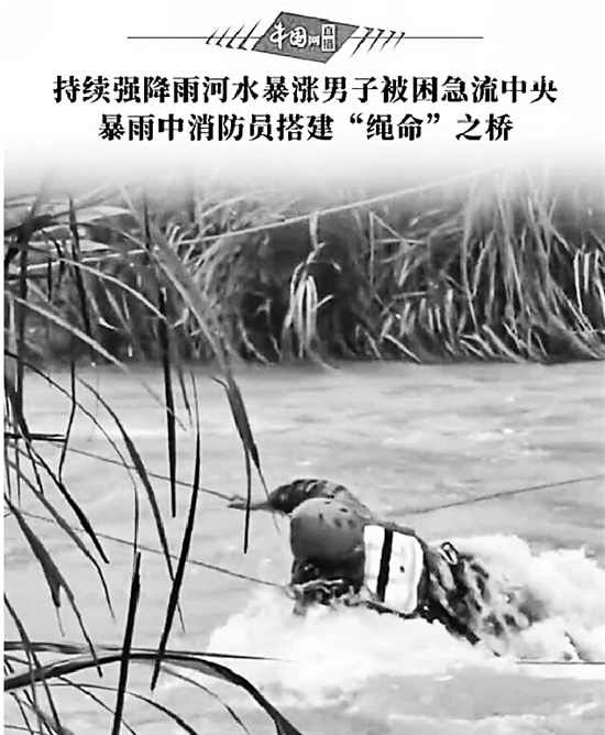 近日,在江西抚州,持续降雨导致河水暴涨,一名男子被困急流中央。暴雨中,消防员用绳索搭桥横渡急流,将被困男子救起。网友:消防员们辛苦了!