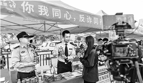 昨日下午,温州市公安局龙湾区分局海城派出所民警“摆摊”宣讲防范电信网络诈骗知识,并通过直播形式传播给更多群众。