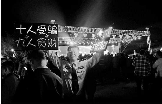 近日,温州市龙湾区海城街道举办了一场“全民反诈 共富同行”晚会。海城派出所民警项潇赶到现场,高举特制的灯牌,向现场群众宣传反诈知识。 通讯员 薛圣亮 摄