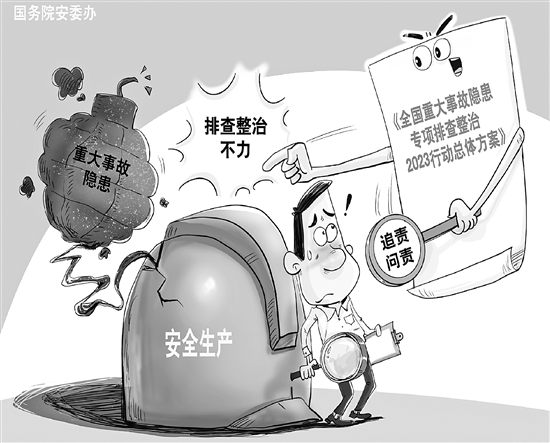 | 国务院安委会于4月底印发《全国重大事故隐患专项排查整治2023行动总体方案》。应急管理部安全协调司司长汪崇鲜近日表示,下一步,国务院安委会办公室将围绕加强统筹调度、重点督导检查、强化跟踪问效三个方面,进一步加大专项行动工作力度。其中,对于排查整治工作推进不力的单位,将视情进行严肃追责问责。 新华社 王鹏 作 |