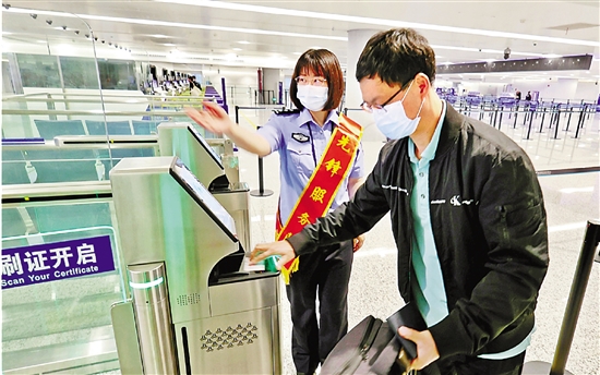 5月15日8时许,不少旅客在杭州萧山国际机场边检候检大厅的快捷通道有序办理边检手续。作为近三年第一批使用快捷通道的旅客,他们在出入境边防检查站民警的引导下,每人仅花十多秒就完成了刷护照、摁指纹等通关流程,就像坐地铁一样方便,“对经常出入口岸的人来说,真的节省了不少时间。”