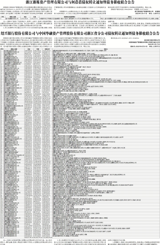 根据绍兴银行股份有限公司与中国华融资产管理股份有限公司浙江省分公司签订的《不良债权批量资产转让协议》,绍兴银行股份有限公司已将其对下列借款人及其担保人享有的权利(包括但不限于担保债权、违约金债权、损失赔偿权、利息债权)依法转让给中国华融资产管理股份有限公司浙江省分公司。绍兴银行股份有限公司特公告通知各债务人及担保人(或义务承担人),从公告之日起向中国华融资产管理股份有限公司浙江省分公司履行相关义务。中国华融资产管理股份有限公司浙江省分公司作为上述资产的受让方,现公告要求债务人及担保人或义务承担人,从公告之日起向中国华融资产管理股份有限公司浙江省分公司履行主债权合同及担保合同约定的偿付义务或相应的担保责任或法院判决文书所确定的义务。特此公告。