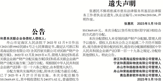 舟山市定海区人民法院于2022年12月9日作出(2021)浙0902民破6号之七民事裁定书,裁定认可浙江和易海运股份有限公司(含其四家关联公司)的《破产财产分配方案》。2022年12月及2023年4月,管理人制定《和易系关联企业破产财产分配实施方案》及《和易系关联企业破产财产分配实施方案二》进行分配。现根据《中华人民共和国企业破产法》第一百一十六条之规定,由本管理人执行。