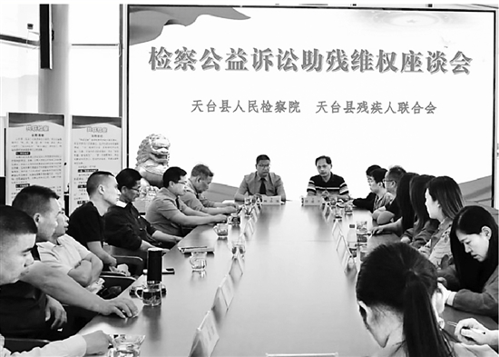 | 公益诉讼助残维权 近日,天台县检察院与县残疾人联合会共同签署《关于充分发挥公益诉讼检察职能加强残疾人权益保障的协作机制》,并联合召开“检察公益诉讼助残维权座谈会”,围绕“发挥协作机制作用,加强残疾人权益司法保护”展开交流。 台州政法融媒体中心 张晓琼 通讯员 周志强 摄 |