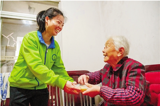 | 5月22日,在南昌市青云谱区岱山街道梨园南社区,社区食堂工作人员为87岁独居老人周桂莲送餐上门。 近年来,江西省南昌市青云谱区围绕养老服务,积极推进社区食堂建设,让更多老年人在家门口的“小食堂”里享受到热气腾腾、经济实惠的饭菜。目前,青云谱区社区老年食堂已开业4家,针对60岁以上老人用餐有不同程度优惠,其中90岁以上老人可免费用餐。 新华社 彭昭之 摄 |
