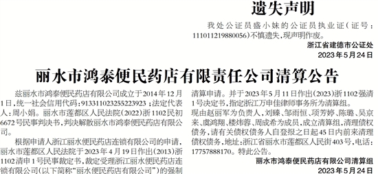 根据申请人浙江丽水便民药店连锁有限公司的申请,丽水市莲都区人民法院于2023年4月19日作出(2013)浙1102清申1号民事裁定书,裁定受理浙江丽水便民药店连锁有限公司(以下简称“丽水便民药店有限公司”)的强制清算申请。并于2023年5月11日作出(2023)浙1102强清1号决定书,指定浙江万申佳律师事务所为清算组。