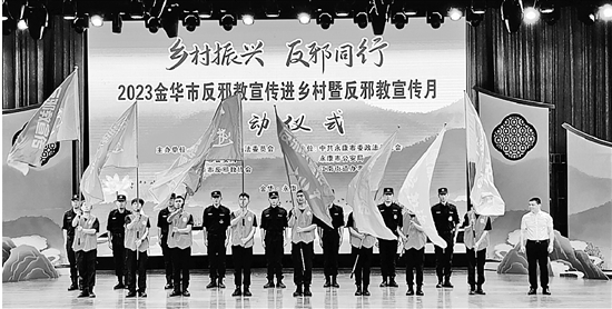 本报讯 近日,金华市“乡村振兴 反邪同行”反邪教宣传进乡村暨“十地百场”反邪教宣传月活动启动仪式在永康江南街道园周村举行。活动由金华市委政法委、市公安局、市反邪教协会主办,永康市委政法委、市公安局、江南街道办事处承办。