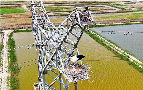 | 5月24日,成年东方白鹳在铁塔上照顾幼鸟(无人机照片)。 2019年3月,两只东方白鹳在位于辽宁省盘锦市二界沟镇的一个输电铁塔上筑巢,并于今年成功孵化了两只幼鸟。4年多来,国家电网盘锦供电公司采取增加巡视频率,为东方白鹳增加绝缘隔离挡板等措施,尽最大努力为它们提供安全的生存环境。 新华社记者 杨青 摄 |