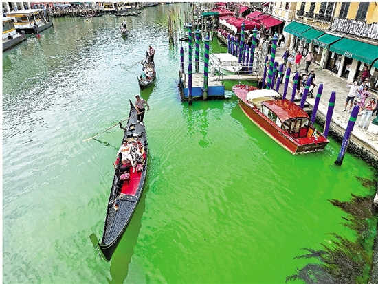 威尼斯运河惊现荧光绿