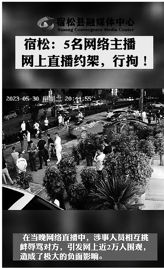 近日,安徽宿松县5名网络主播为快速涨粉、吸引关注,通过线上直播约架,线下聚众滋事的方式,故意制造热点话题,事发现场部分人员通过网络平台实时直播冲突场景,引发近2万网民在线围观。目前,5人均因涉嫌寻衅滋事被行政拘留。