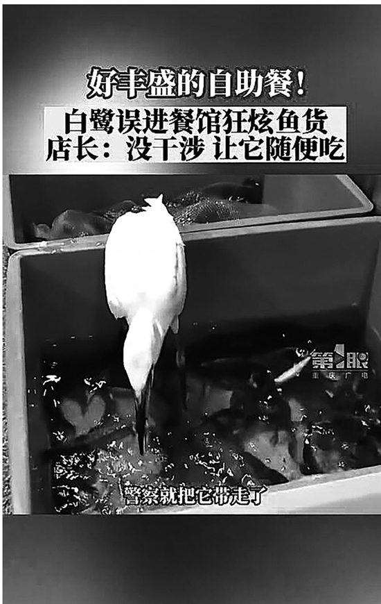 近日,重庆,一只白鹭误打误撞闯进一家餐馆,进店后直奔厨房,在鱼箱边开启自助模式。白鹭是国家二级保护动物,店长称大家也没干涉,就让它随便吃,后面报警让警察带走了。