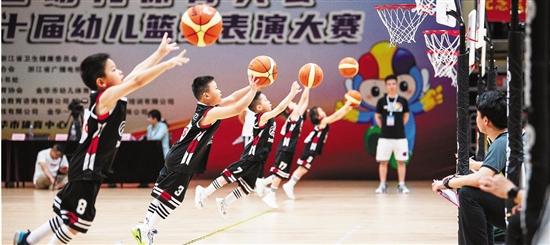 近日,浙江省第十届幼儿篮球表演大赛在金华市体育中心体育馆举行。来自全省各地的52支代表队共近千名幼儿运动员参加了胯下运球、45秒投篮、6人定点传球和动感篮球自编操等项目表演比赛,营造喜迎亚运浓厚氛围。