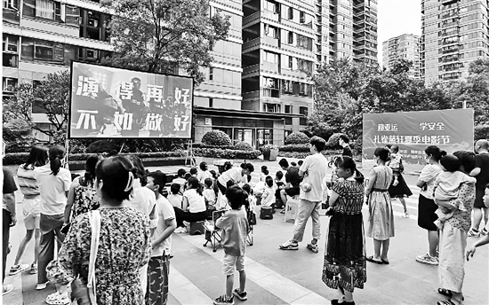近日,杭州祥符街道蓝孔雀社区孔雀蓝轩小区组织开展“迎亚运、学安全”夏季电影节活动,邀请杭州印核文化在小区广场上播放露天电影,在播放电影正片前,先播放消防安全、反诈防骗和亚运会等方面的宣传片,营造“平安喜悦迎亚运”的氛围。