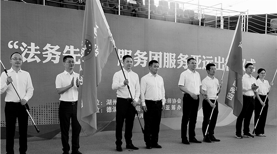 本报讯 近日,湖州市“法务先锋”服务团服务亚运出征仪式在德清地理信息小镇举行。