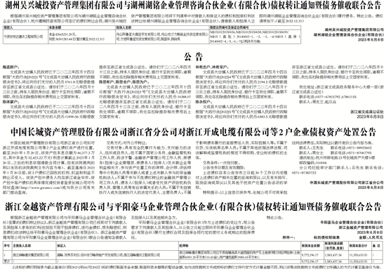 根据浙江金越资产管理有限公司与平阳豪马企业管理合伙企业(有限合伙)签署的《债权转让协议》,浙江金越资产管理有限公司已将其对下列借款人及其担保人享有的权利(包括但不限于担保债权、违约金债权、损失赔偿权、利息债权)依法转让给平阳豪马企业管理合伙企业(有限合伙)。浙江金越资产管理有限公司与平阳豪马企业管理合伙企业(有限合伙)联合公告通知各借款人及担保人以及其他相关各方。