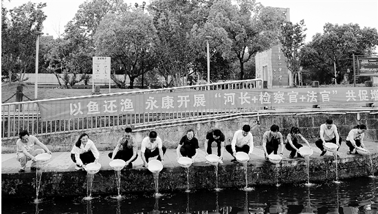 近日,永康法院联合河长办、检察院等部门,在江畔开展增殖放流活动。此次放入江中的5万余尾鱼苗由一名非法捕捞水产品的当事人提供,法院判令其用“看得见”的赔偿,弥补对水生态环境造成的损害,实现惩治犯罪和保护生态环境有机衔接。 通讯员 徐柳琳