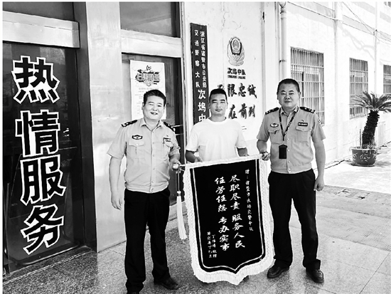 本报讯 近日,诸暨市民丁先生专程来到诸暨交警大队次坞中队,送上一面锦旗,上书 “尽职尽责服务人民,任劳任怨专办实事”。
