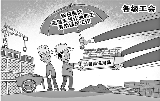 | 当前,全国各地陆续进入夏季高温季节。全国总工会日前印发《关于做好2023年职工防暑降温工作的通知》,要求各级工会充分认识做好职工防暑降温工作的重要性,把做好高温作业和高温天气作业职工劳动保护工作作为工会服务职工、维护职工权益的重要内容,纳入工会工作的重要日程。 新华社 朱慧卿 作 |
