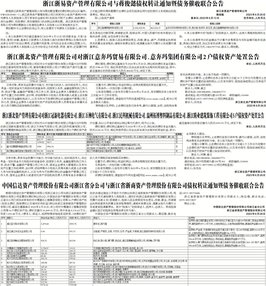 根据浙江浙易资产管理有限公司与蒋俊懿签署的《债权转让协议》(编号:YW032023081-1),浙江浙易资产管理有限公司已将其对《公告资产清单》中所列债务人及其担保人项下享有的全部权利(包括但不限于主债权、担保债权、违约金债权、利息债权、损失赔偿权)依法转让给蒋俊懿。浙江浙易资产管理有限公司与蒋俊懿联合公告通知各债务人及担保人以及其他相关各方。