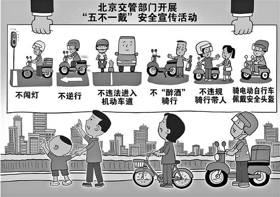 日前,北京市交管局会同相关部门以“不闯灯、不逆行、不违法进入机动车道、不‘醉酒’骑行、不违规骑行带人、骑电动自行车佩戴安全头盔”为内容开展“五不一戴”安全宣传活动。
