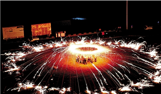 | 7月5日,河北省滦平县火斗山镇大店子村的民间艺人在表演“抡花”。 “抡花”是河北省滦平县一项传统民俗,已被列入国家级非物质文化遗产名录。表演时,几名民间艺人将木炭和碎铁片一起放到挂在花架上的花筒中燃烧,再合力抡起花架,使花筒内升温并向四周甩溅铁花,形成一圈圈光线交织的光环,景象壮观。 新华社 牟宇 摄 |