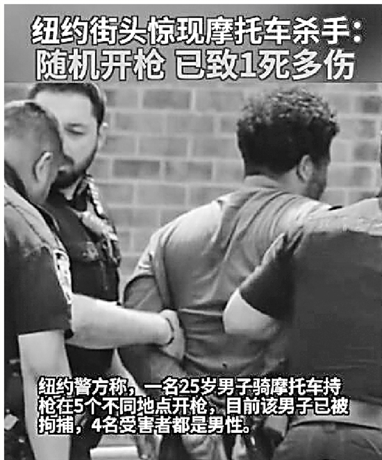 据美媒报道,美国纽约昆斯区和布鲁克林区日前发生连环枪击事件,已造成1人死亡、3人受伤。纽约警方称,一名25岁男子骑摩托车持枪在5个不同地点开枪,目前该男子已被拘捕,4名被害者都是男性。警方称,该连环枪击事件似乎是“随机的”,尚不清楚该男子的作案动机。