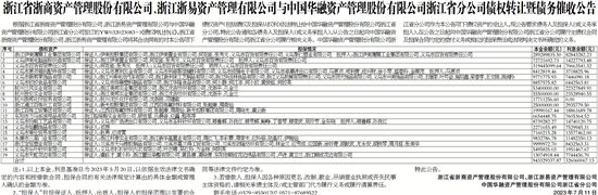 根据浙江省浙商资产管理股份有限公司、浙江浙易资产管理有限公司与中国华融资产管理股份有限公司浙江省分公司签订的YW032023083-1《债权转让协议》,浙江省浙商资产管理股份有限公司、浙江浙易资产管理有限公司将其合法拥有的对本公告项下债权资产(包括债权及担保从权利)依法转让给中国华融资产管理股份有限公司浙江省分公司,特此公告通知各债务人及担保人(或义务承担人),从公告之日起向中国华融资产管理股份有限公司浙江省分公司履行相关义务。中国华融资产管理股份有限公司浙江省分公司作为本公告项下债权资产的受让人,现公告要求债务人及担保人(或义务承担人),在公告之日起向中国华融资产管理股份有限公司浙江省分公司履行主债权合同及担保合同约定的偿付义务或相应的担保责任或法院判决文书所确定的义务。