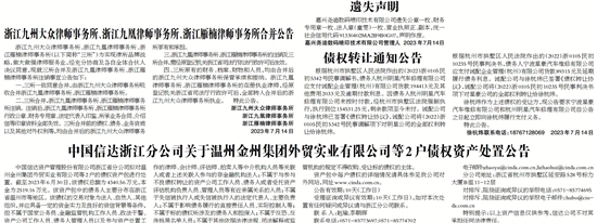 中国信达浙江分公司关于温州金州集团外贸实业有限公司等2户债权资产处置公告