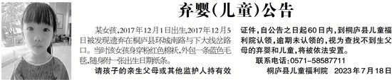 某女孩,2017年12月1日出生,2017年12月5日被发现遗弃在桐庐县环城南路与下大线岔路口。当时该女孩身穿粉红色棉袄,外包一条蓝色毛毯,随身附一张出生日期纸条。