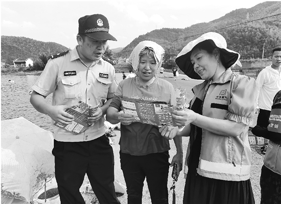 近日,杭州市富阳区常安镇联合当地派出所,来到当地热门的嬉水乐园蚌潭坝开展平安巡防和防溺水劝导,同时不忘向游客宣传反诈知识。
