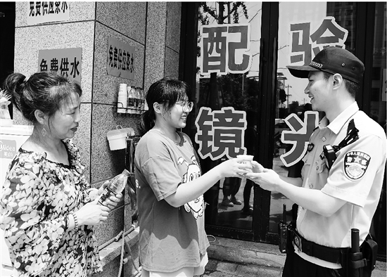 夏日炎炎,临海市公安局杜桥派出所全力做好社会面防控和服务群众工作。民警王翔走在执勤路上时,热心群众送上一杯凉茶。
