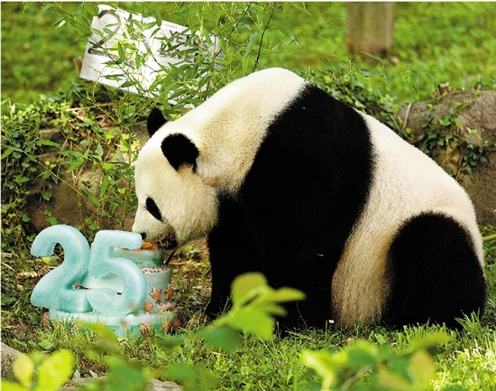 当天上午9时,该动物园工作人员为“美香”送上营养部门精心设计和制作的蛋糕,由冷冻稀释苹果汁制成的数字“25”十分醒目,蛋糕上还有红薯泥、胡萝卜泥、苹果切片和竹子等。