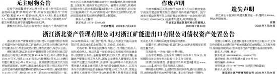 宁波市镇海区人民法院于2023年7月10日裁定宣告宁波东方君益贸易有限公司破产并终结破产程序。因宁波东方君益贸易有限公司的营业执照(统一社会信用代码91330211308995892X)正副本均遗失,现声明作废。