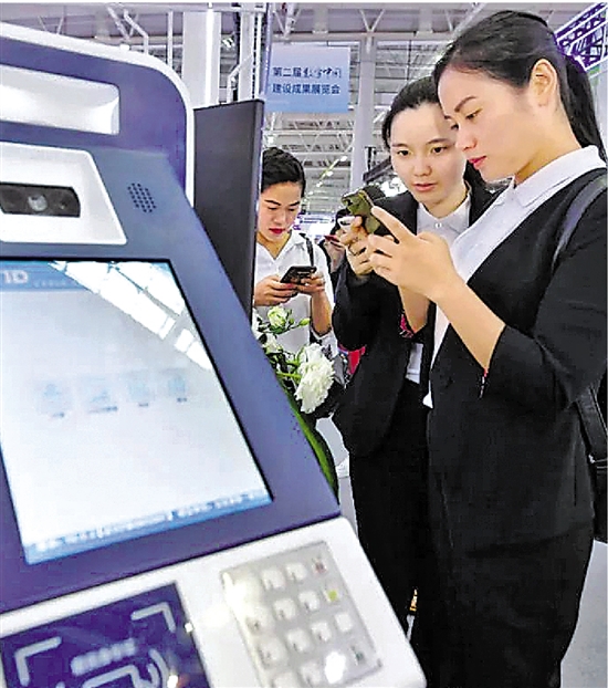 | 数字中国建设成果展上,参观者用手机办理居民身份证网上功能凭证。 宋为伟 摄 |
