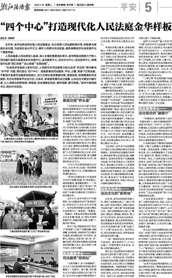 “社会经济发展进入新时代后,人民群众对司法服务已经从追求‘有没有’转向解决‘好不好’问题,我们提出‘四个中心’,就是要推动司法服务、平台、力量、资源下沉到法庭,不断提升基层司法服务供给能力,全力为群众提供普惠均等、便捷高效、智能精准的司法服务,充分利用各类平台全方位、立体式、多角度传播司法正能量,让法治文化更加可触可感,让人民群众的获得感、幸福感、安全感更加充实、更有保障、更可持续。”金华中院党组书记、院长叶向阳说。