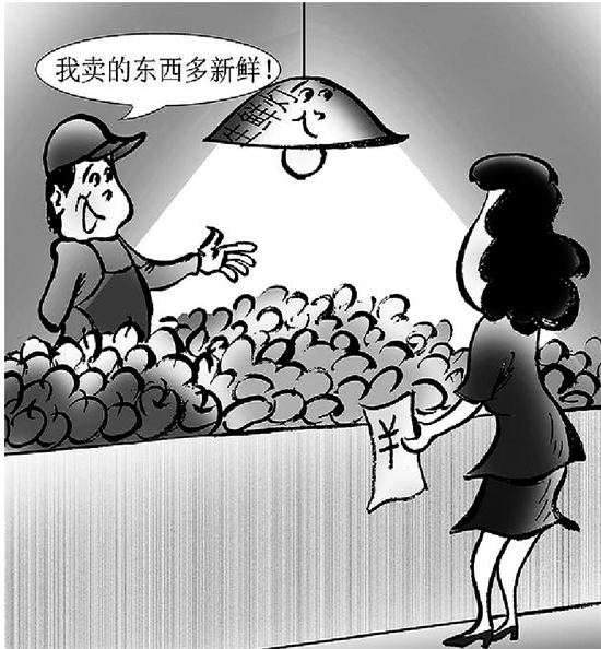 生活中,不少消费者都有这样的体会:在超市、菜市场灯光下看着光鲜的肉食、水灵的蔬菜,买回家后却发现并不新鲜“养眼”,俨然“卖家秀”和“买家秀”的区别。其实,肉还是那块肉,奥妙都在灯上。在店里,经营者使用了特殊的灯具,通过调整光照颜色或在光源外加红色鲜艳灯罩,使得所销售的生鲜农产品看起来色泽亮丽、更加美观。这种专门用来给生鲜农产品提色增亮的灯具,被形象地称为“生鲜灯”。眼下,“生鲜灯”在各地超市、菜市场中被普遍使用,进而形成了一种“光学营销”套路——红灯搭配冷白光用于鲜肉区,增强鲜肉新鲜感;绿光搭配正白光用于蔬菜区,让蔬菜看起来更新鲜;冷白光用于海鲜区,让水产看起来更鲜活……