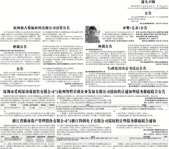 本公司业经杭州市萧山区人民法院作的生效判决判令解散,根据《中华人民共和国公司法》及章程相关规定,公司已于2023年7月5日成立清算组进入清算阶段。请有关债权人自接到本公司书面通知书起三十日内,未接到通知书的自本公告之日起四十五日内,提交有关证明材料向本公司清算组申报债权及办理债权登记手续,逾期不申报的视为没有提出要求。特此公告!
