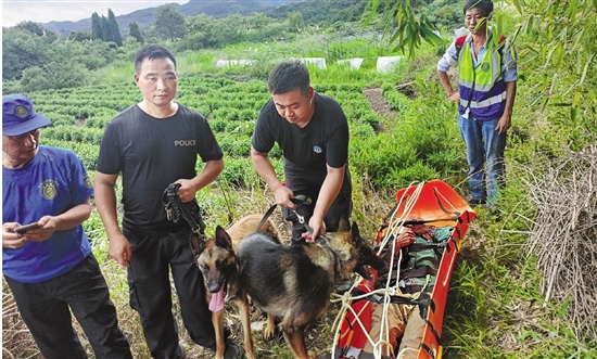 本报讯 近日,来自嵊州市公安局巡特警大队、蓝海救援队等的多名搜救人员和搜救犬一起,历时3天搜寻,成功找到迷路的九旬老人。