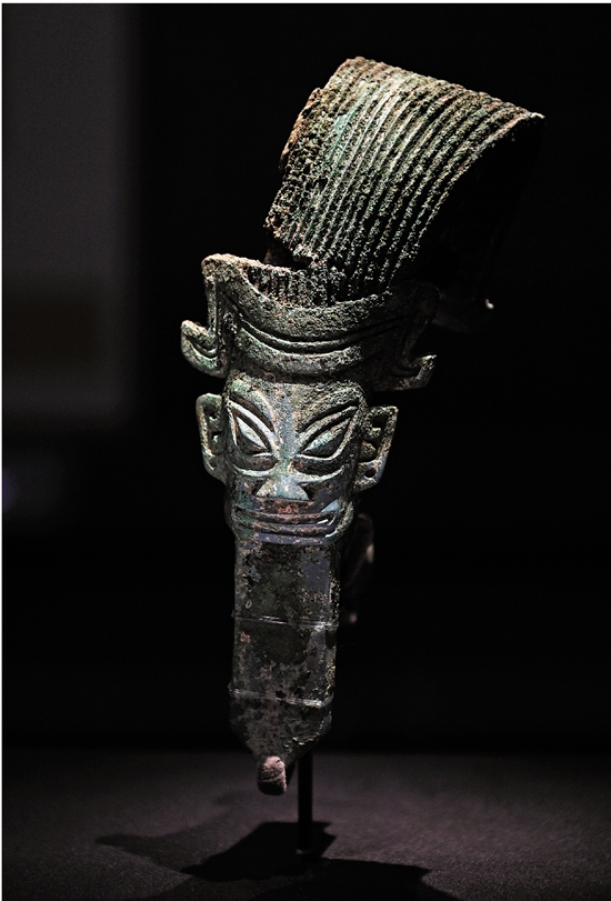 | 这是7月17日在三星堆博物馆新馆拍摄的立发青铜人像。 |