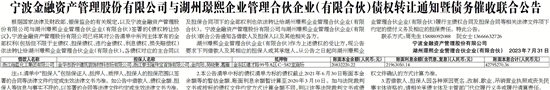 根据国家法律及财政部、银保监会的有关规定,以及宁波金融资产管理股份有限公司与湖州璟熙企业管理合伙企业(有限合伙)签署的《债权转让协议》,宁波金融资产管理股份有限公司已将其对公告清单中所列主体享有的全部权利(包括但不限于主债权、担保债权、违约金债权、利息债权、损失赔偿权)依法转让给湖州璟熙企业管理合伙企业(有限合伙),各债权对应的主合同以及担保合同项下的全部权利也依法转让给湖州璟熙企业管理合伙企业(有限合伙)。宁波金融资产管理股份有限公司与湖州璟熙企业管理合伙企业(有限合伙)联合公告通知各借款人及担保人以及其他相关各方。