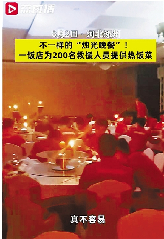 8月2日凌晨2点,河北涿州一饭店为近200名刚从一线返回休整的救援人员提供热饭菜。因停水停电,所有厨师都顶着高温,用仅存的水蒸馒头、做热饭菜。水用完了,饭店老板宋先生又去水厂借水。他说,“中国人团结,必须的!”
