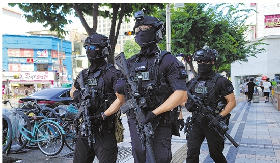 | 8月6日,全副武装的特警在韩国大邱街头巡逻。 |
