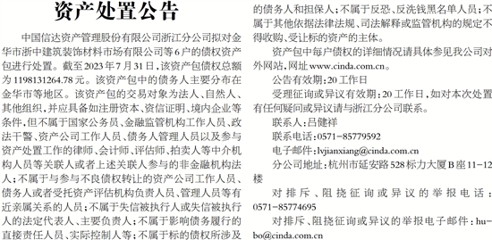 受理征询或异议有效期:20工作日,如对本次处置有任何疑问或异议请与浙江分公司联系。