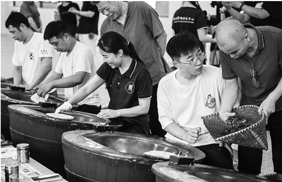 8月9日,杭州西湖风景名胜区举行2023西湖龙井茶年轻人炒制技艺集训成果展示交流。来自21个集训点的41名学员代表以实战实赛展示15天炒茶的学习成果,其中年纪最小的还只是高中生。这群在茶乡长大的年轻人在三伏天经受住了近200℃锅温的“烤验”,没有落下过一节课。