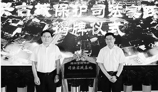 绍兴中院党组成员、副院长胡坚,绍兴市名城办党工委副书记、主任徐觉民共同为绍兴古城保护司法实践基地揭牌