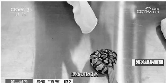 近日,在广东深圳福田口岸,海关官员在入境通道执法时,发现一名旅客形迹可疑,随即引导其前往查验台进一步检查,在其裤兜内查获了用棉袜和丝袜包裹的活体球蟒蛇3条,家蛇属活体蛇11条。此外,多地海关也在寄递邮件中截获了活体鱼、蜥蜴、长戟大兜虫等来自国外的异宠。这些没有经过检疫的动物有传播疫病的风险。