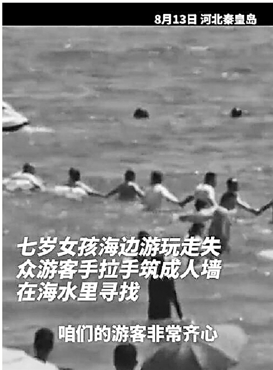 近日,河北秦皇岛,7岁女孩海边游玩走失,众游客手拉手筑成人墙在海水里寻找。历经3个半小时,孩子被成功找到,孩子妈妈鞠躬致谢。网友:拉的不是手,是骨子里的团结!